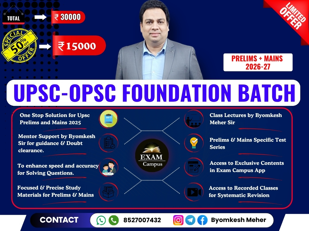 UPSC-OPSC FOUNDATION COURSE 2026-27 π UPSCβOPSC FOUNDATION COURSE 2026β27 ποΈ By Byomkesh Meher β UPSC Exam Campus (Free Mentorship | Answer Writing | Test Series) π«‘ Dear Aspirants & Future Officers, If youβre aiming for UPSC or OPSC 2026β27, this is the perfect time to build your foundation the right way. We are launching a FREE Strategy & Mentorship Program designed for early-stage aspirants β with everything you need to stay on track and ahead. π What You Will Get: β Complete Syllabus Breakdown (UPSC + OPSC) β Personalized Strategy (Prelims, Mains & Interview) β Weekly & Monthly Study Plan β FREE Mains Test Series (GS + Essay) β Regular Answer Writing Practice with Feedback β Optional Subject Guidance β Doubt Clearing + One-on-One Mentorship β Motivation & Support throughout the journey π± Ideal for college students, working professionals, and first-time aspirants. π¬ Language: English & Hindi | Online & WhatsApp-based support π°οΈ Call for Guidance: Daily 1 PM β 3 PM π² WhatsApp Anytime (24Γ7): Feel free to message or ask doubts "My duty is not just to teach, but to guide every sincere student until they succeed." β€οΈ With warm regards, Byomkesh Meher π§ UPSC Exam Campus β Strategy. Support. Success. π 8527007432